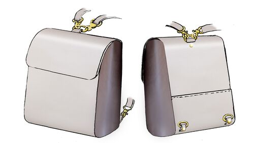 10年も悩んで ウソデス10日です やっと結論が出たリュック型の家内のバッグ デザインスケッチはこちら 今回は雑ですがこんなイメージです フタはマグネットホックで留めますので金具は表に出ません 右の図のように背中側にスマホポケット 背負ったときでも背…