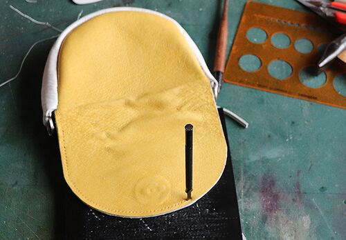 昨日載せました図面を切り抜いて型紙に 取りあえず型紙を組みたててみました もう一枚出力して 肩紐部分とマチ部分も切り出し フタ部は曲げながら貼り合わせるので 本体部のみ接着剤を塗ってオモテの黄色い革を貼り付けました 縫って裏返すのでウラから菱目…