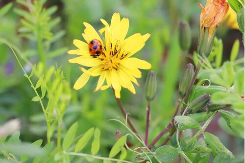 朝のウォーキング 2日に一回は望遠レンズを着けたカメラを持って歩いている テントウムシがジシバリにとまっていたので シャッターを切った ジッとしているので 大丈夫か?と触ったら転倒した! シャレになんない?でもホントに転んで落っこちた 元に戻して…