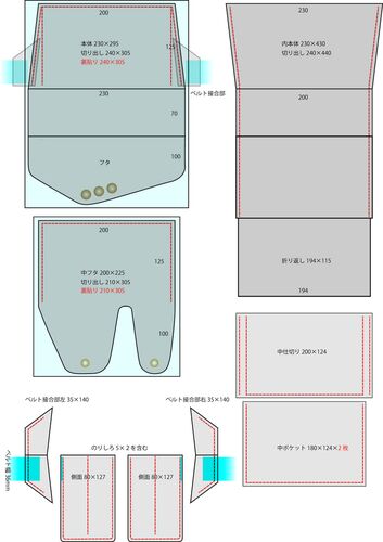型紙を作る 水色の部分は粗裁ちで裏貼りもします 切り出します パーツは多いですね 組みたててみました 外蓋を開けるとこんな具合 閉じるとこんな感じ 後ろの外ポケットです スリッパを作った残り革からとる部分を当ててみたらギリギリ 余裕無し! オモテに…