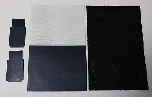 オモテ面は押し柄の入った明るいグレーと 紺のバイカラー 内面はブラックで眼鏡ケースを作ります! 外寸幅164mm×高さ55mm×厚さ40mm パーツは5mmくらい大きめにカット 背面でグレーと紺の革を継ぐので 断面はナナメカットして隙間が出来にくい作りで…
