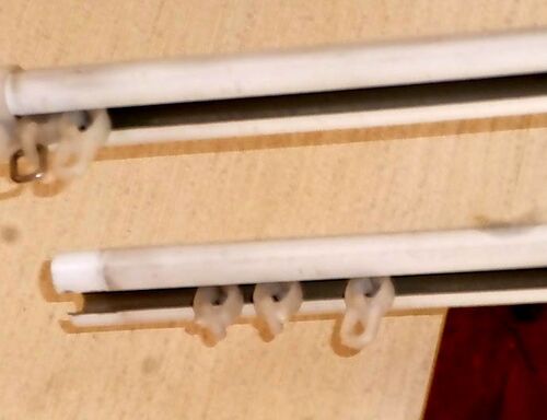 カーテンレールのコロコロの引っ掛ける部分が壊れた 端っこのキャップを外して 軟らかいのでドライバーでぐにゅっとやって引っこ抜きます 下が壊れたものです 左が壊れた3個 カーテン1枚当たり7個使っていて 窓2か所分28個必要なので20個入りと10個入りを買…