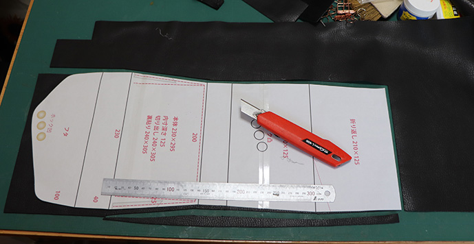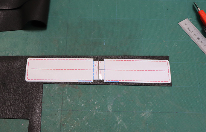左からベルト・本体・糸・ホック・ベルト接合部・底ウラ貼り・蓋部分ウラ貼り