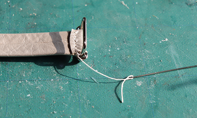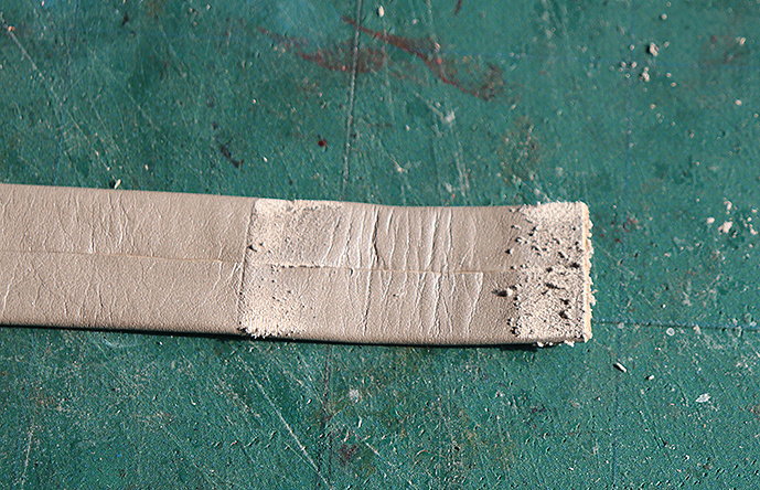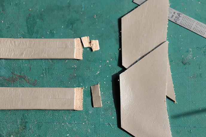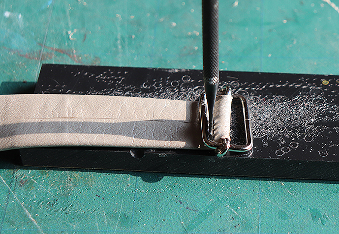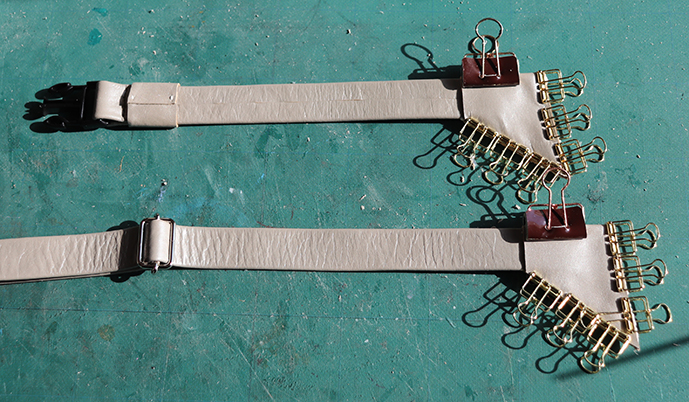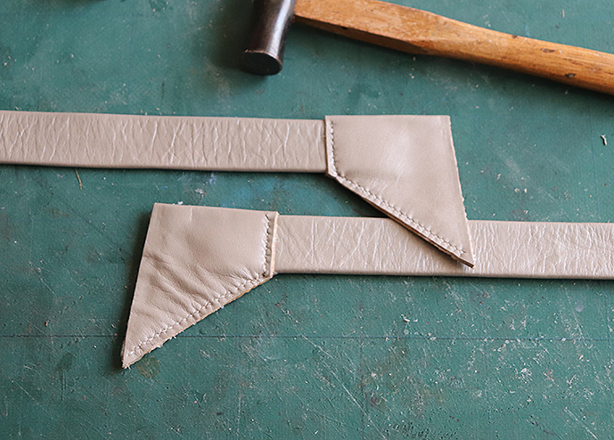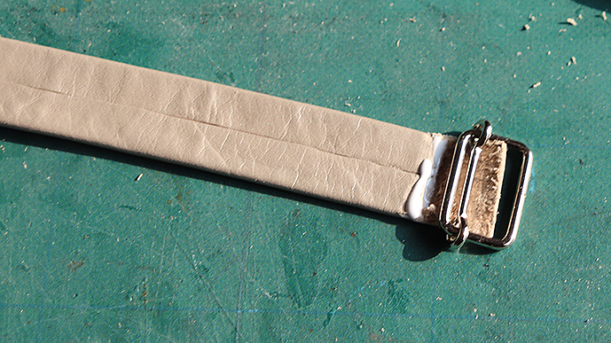 2023-01-11 ベルトの製作 レザークラフト センオクリビジョウの接続です センオクリビジョウの真ん中に着ける部分を荒らして ボンドを塗って 曲げて固定 菱目打ち 縫い付け バックルの接続です 同じように接着して➡菱目打ち➡縫い付け 本体との接合部 デザイン上あった方が良さそうなので 台形のパーツを接続 段差はなるべく避けたいので本体のナナメの傾斜に合わせ 削ぎ落とします 両端に台形パーツを着ける作業になります 接着部を荒らします ボンドを塗って クリップ止め ステッチをトンカチで叩いてならし ベルトは完成です!
