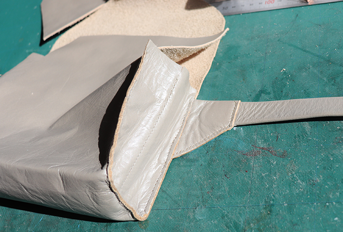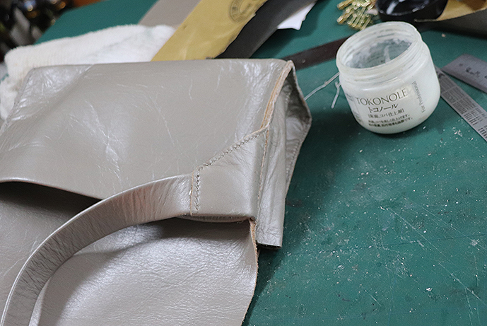 2023-01-14 組み立てのつづき レザークラフト 背のスマホポケットを付けたフタのパーツに ベルトを接着 側面パーツを貼り付けて菱目打ち➡縫い付け まだガサガサの切り口(コバ)にサンドペーパーを掛けます その時ベルト接続部(台形のパーツ)に傷が付かないようにマスキング 今回は明るく艶のある革なので慎重にやっています そのコバにサンドペーパー100を掛けて トコノールを塗って 乾いたらまたサンドペーパーを掛け トコノールをもう一度塗りこんどは#400番の サンドペーパーで削り滑らかにしました さらにトコノールを薄く塗って 磨き上げます。