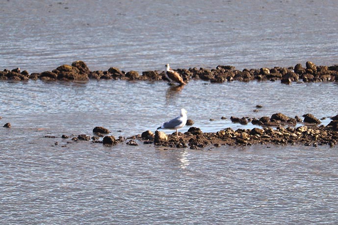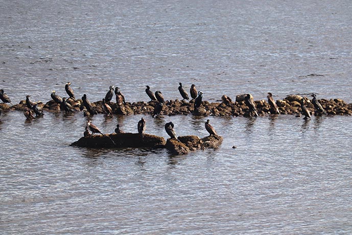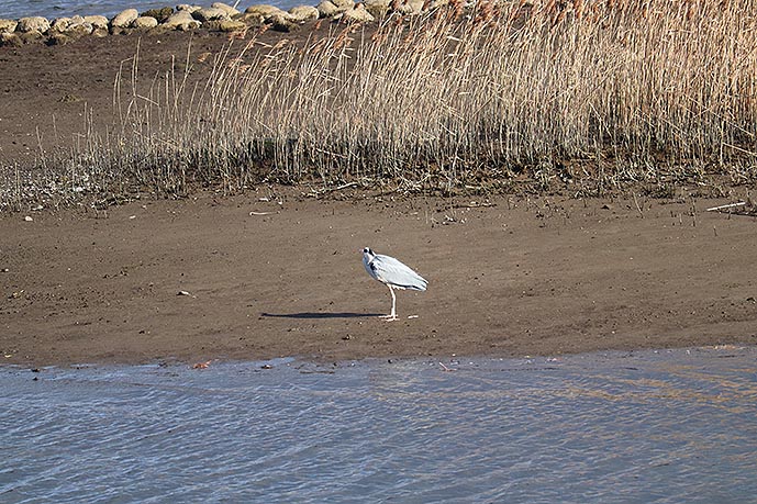 2025-01-14 寒くても鳥達は元気なようです さんぽの途中 小さな風景 いつも釣りをしている場所から1km上流です ハクセキレイでしょうか? 二日前にも鯵をあげた お魚チョウダイのアオサギ嬢 中州で狩の最中 手前はいつもやってくる1本足のウミネコさん カワウ?の団体さんも日光浴をしていました。彼らも毎日が大変ですよね。